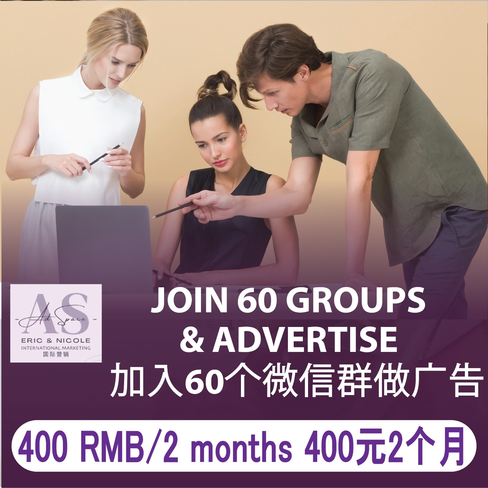 Join WeChat Advertising & Networking Groups for 2 Months – 60 Groups Join our Ad Space network and be part of one of the biggest and fastest growing networks of International business and social Wechat communities in China. ï¿¥ 400